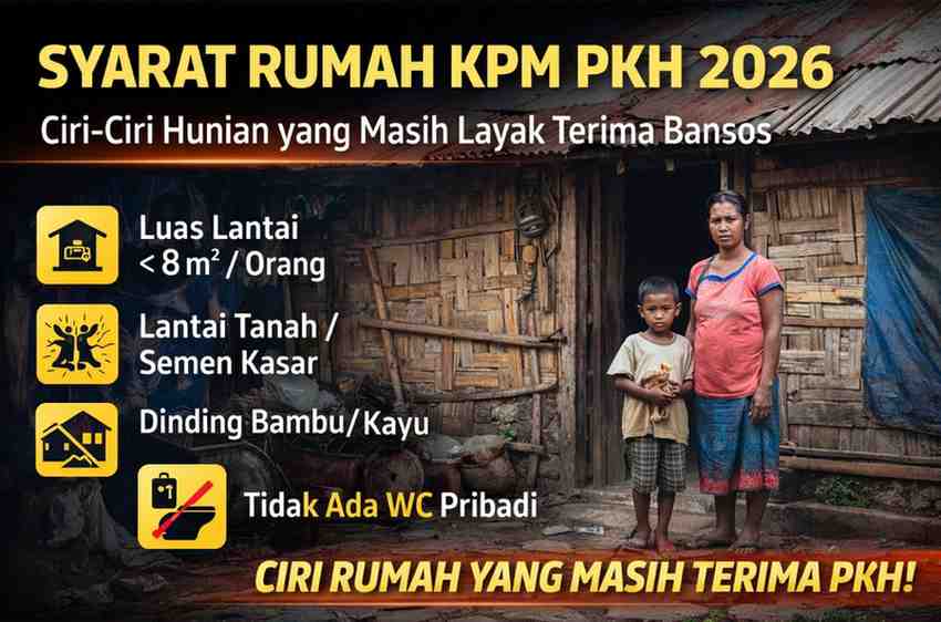 Syarat rumah KPM PKH 2026 ditetapkan bukan untuk mempersulit, melainkan memastikan bantuan tepat sasaran. Rumah dengan lantai tanah/semen kasar, dinding tidak permanen, atap sederhana, sanitasi minim, dan listrik subsidi menjadi indikator utama keluarga prasejahtera.